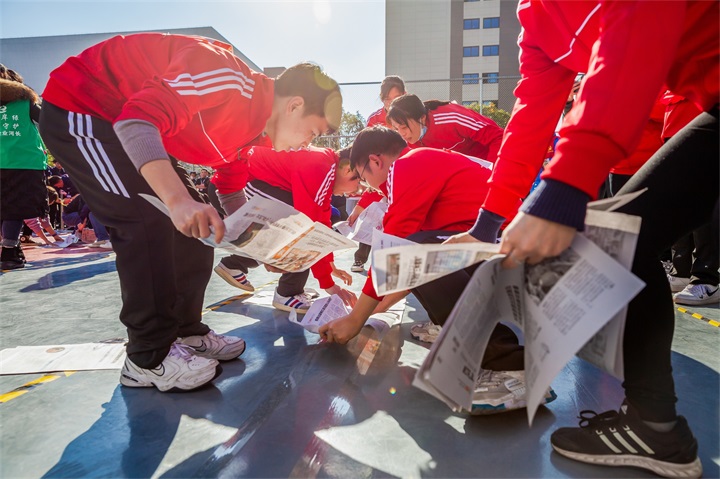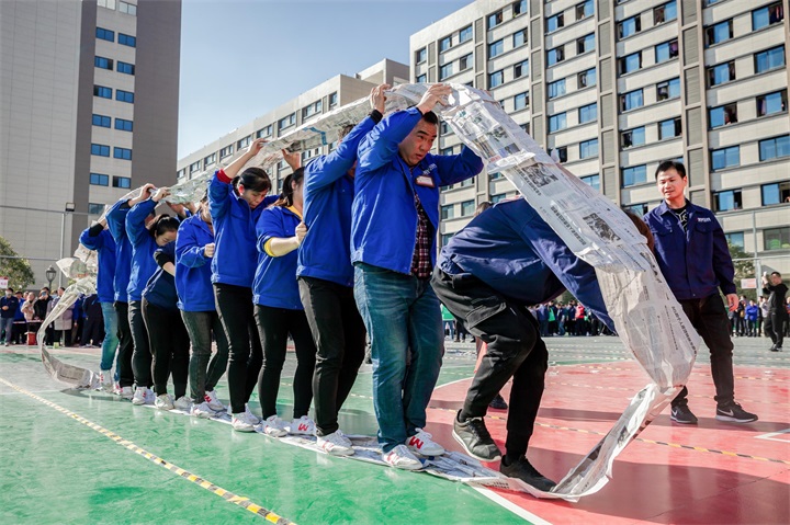 車輪滾滾也是一項十分考驗團(tuán)隊默契的項目,需要將30張報紙用膠帶粘好,選手們站在報紙內(nèi),依托多余的報紙往前傳遞從而讓選手不斷前進(jìn),但是比賽并不會盡如人意,各種猝不及防的意外讓本就充滿趣味的接力賽更加妙趣橫生。